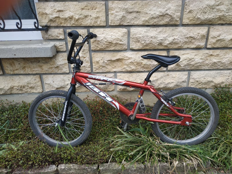 Bmx de couleur rouge vendre. Sur le cadre des autocollants blanc sont prsents, ils rsistent la pluie… . Pdales sans marques apparententes avec dessus des crampons et des clairages. Le BMX ne possde pas de freins avant mais bien un frein arrire. Le BMX est quip de freins patins assez utiliss. Avant la vente la chambre air sera change et le frein arrire sera huil correctement.